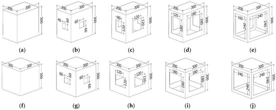 Figure 1 shows the tested box samples. Five different box lengths with 5 different cutout rates were tested; therefore, 25 types of samples were analyzed for this study. The widths and heights of the samples were the same, 300 mm in each case. The length dimension of the boxes varied from 200 mm to 600 mm with a 100 mm increment. The cutout rates were 0%, 4%, 16%, 36%, and 64% with respect to the total surface area of the sidewalls of the boxes. These cutouts were positioned in the middle of the sidewalls of the boxes along all four sides, as shown in Figure 1.