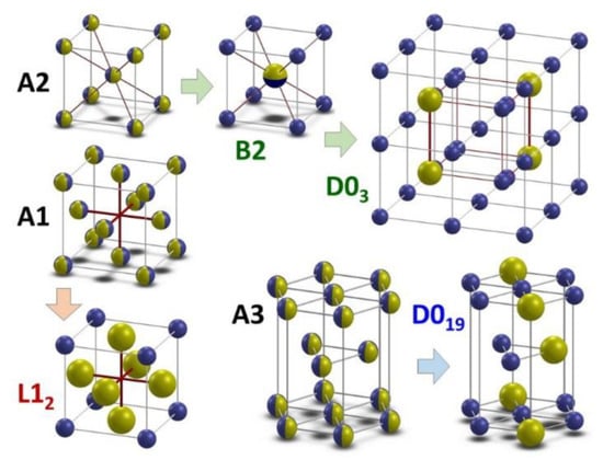 - Golovin, I.; Palacheva, V.; Bazlov, A.; Cifre, J.; Nollmann, N.; Divinski, S.; Wilde, G. Diffusionless nature of D03 → L12 transition in Fe3Ga alloys. J. Alloys Compd. 2016, 656, 897–902. [Google Scholar] [CrossRef]