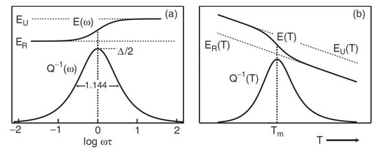 - In frequency-dependent IF tests (FDIF), at a fixed temperature (τ is a constant in Equation (2) for a given fixed temperature), the frequency f is varied over a few orders of magnitude. This method allows direct measurements of Q−1 and E spectra vs. ω·τ, as introduced by Equation (2) and shown in Figure 4a [101]. The results can also be presented as a function of f (f = ω/2π, as τ is a constant for a chosen temperature of measurements).