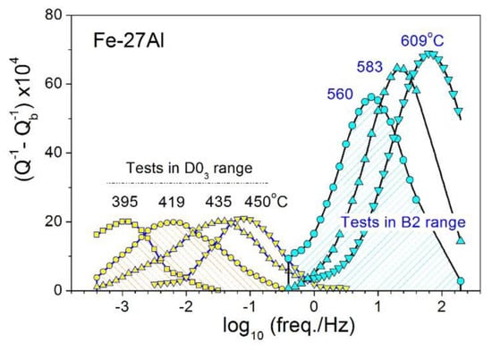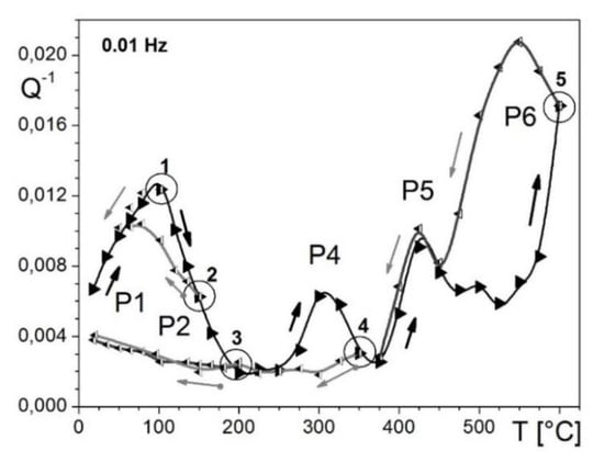 - A total of 2 broad low-temperature peaks (−80–20 °C, f ≈ 230 Hz and 2 kHz) with activation energy (H) of about 1 eV were tentatively explained as Hasiguti-type relaxations of dislocations with neighboring self-lattice defects. At the same time, authors would not exclude that these effects may correspond to the β and γ relaxations in bcc structures, i.e., kink pair formation in a0{111}/2 screw dislocations on {110} and {112} slip planes (these peaks were recorded using TDIF tests, and, therefore, they are not shown in Figure 6). Similar peaks were also recorded in Fe–Al alloys [70];