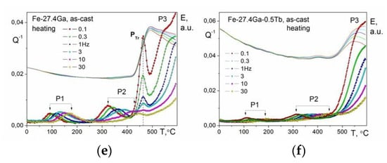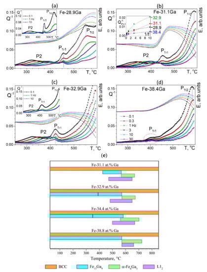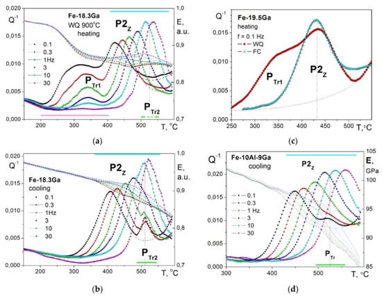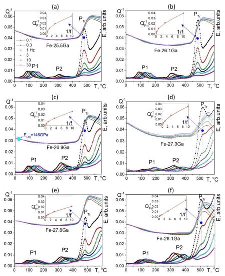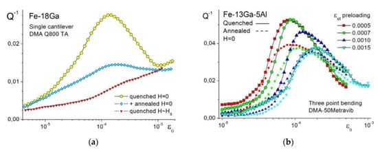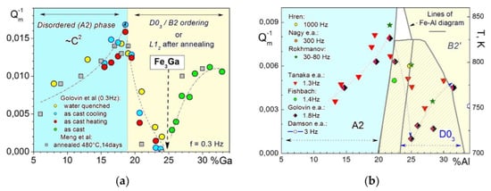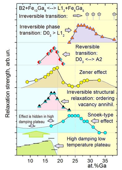 - Golovin, I.S.; Rivière, A. Mechanisms of anelasticity in Fe-13Ga alloy. Intermetallics 2011, 19, 453–459. [Google Scholar] [CrossRef]