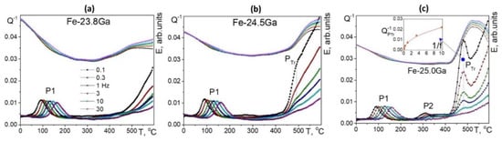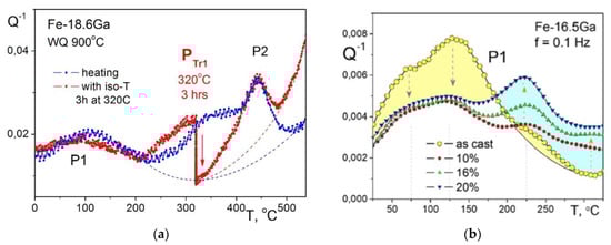 - Double-headed peaks (P1 and P2) in the temperature range between 50 and 200 °C (dependent on measuring frequency). The peak’s activation energy was estimated from Arrhenius plot as HP1 = 0.92–1.08 eV and HP2 = 1.0–1.14 eV and characteristic relaxation time (τ0) between 10−15 and 10−16 s (different setups, TDIF tests). These values obtained from FDIF are similar but not the same: H1 = 1.1 eV, τ01 = 10−16 s (P1 effect) and H2 = 1.04 eV, τ02 = 6 × 10−14 s (P2 effect). A similar peak with the activation parameters H1 ≈ 0.87 eV and τ0 ≈ 10−16 s is recorded in Fe–3Ga alloy. These peaks were attributed to the Snoek type relaxation, i.e., stress-induced carbon atom (C) jumps in Fe-C-Fe and Fe(6-n)-C-Ga(n) positions (here, n is number of Ga atoms in the first coordinate shell of C atom). Similar peaks were also recorded and well resolved in Fe–Al and Fe–Al-Si alloys [80,81];