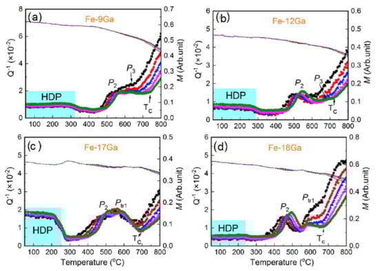 - Sun, M.; Wang, X.; Wang, L.; Wang, H.; Jiang, W.; Liu, W.; Hao, T.; Gao, R.; Gao, Y.; Zhang, T.; et al. High-temperature order-disorder phase transition in Fe-18Ga alloy evaluated by internal friction method. J. Alloys Compd. 2018, 750, 669–676. [Google Scholar] [CrossRef]