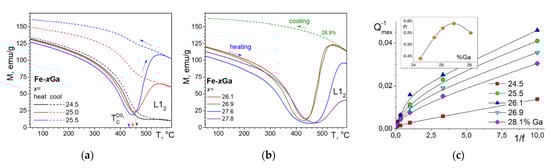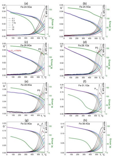 - Golovin, I.; Balagurov, A.M.; Bobrikov, I.; Palacheva, V.; Cifre, J. Phase transition induced anelasticity in Fe–Ga alloys with 25 and 27%Ga. J. Alloys Compd. 2016, 675, 393–398. [Google Scholar] [CrossRef]