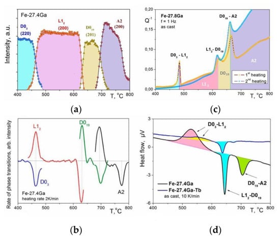 - Golovin, I.; Balagurov, A.; Emdadi, A.; Palacheva, V.; Bobrikov, I.; Cheverikin, V.; Zanaeva, E.; Mari, D. Phase transitions in Fe-27Ga alloys: Guidance to develop functionality. Intermetallics 2018, 100, 20–26. [Google Scholar] [CrossRef]