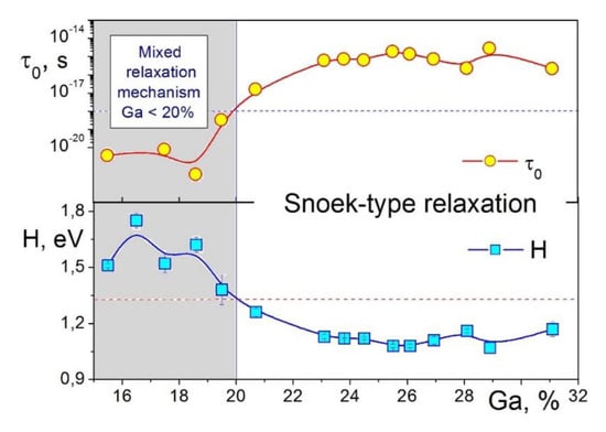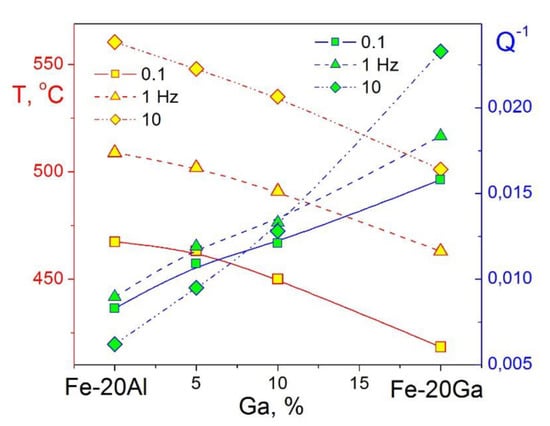 - Boyer, S.A.; Gerland, M.; Rivière, A.; Cifre, J.; Palacheva, V.V.; Mikhaylovskaya, A.V.; Golovin, I.S. Anelasticity of the Fe-Ga alloys in the range of Zener relaxation. J. Alloys Compd. 2018, 730, 424–433. [Google Scholar] [CrossRef]