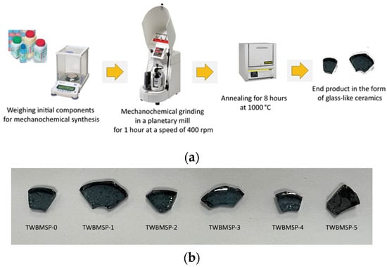 After weighing in a given molar ratio, the obtained mixtures were subjected to mechanochemical grinding in a Pulverisette 6 classic line planetary mill (Fritsch, Berlin, Germany). Grinding was conducted at a grinding speed of 400 rpm for 1 h. After grinding, the obtained mixtures were subjected to thermal sintering at a temperature of 1000 °C in a muffle furnace (Nabertherm GmbH, Lilienthal, Germany). Sintering was carried out for 8 h, AT A heating rate of 10 °C/min, heating to 1000 °C was carried out in 100 min. After exposure for 8 h at a temperature of 1000 °C, the samples were cooled down together with the muffle furnace to reach room temperature within 10–15 h. The samples were sintered in a muffle furnace in air. The obtained ground samples were placed in alundum crucibles, after which they were placed in a furnace and subjected to sintering. The sintering process itself was carried out without applying external pressure. The choice of sintering temperature is because of the initialization of the TeO2 and WO3 compound melts formation processes, which lead to the formation of vitreous ceramics. The scheme for obtaining glass-like ceramics is shown in Figure 1a.
