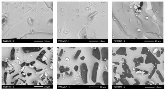 Analysis of the obtained diffraction patterns showed the following. In the case of TWBMSP-0 samples, in which the PbO dopant is absent, no obvious low-intensity or strongly broadened diffraction reflections were observed. Such a diffraction pattern is characteristic of amorphous-like or highly disordered structures, which indicates that the nature of the TWBMSP-0 samples is amorphous and typical of glasses obtained from oxide compounds at high sintering temperatures. A similar nature of telluride glasses was observed in several works, according to which sintering at temperatures above 700–800 °C results in amorphization of the glass structure.