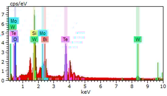 According to a detailed analysis of the X-ray diffraction pattern of the TWBMSP-5 sample, presented in Figure 5b, it was revealed that the observed reflections can be compared to two phases PbWO4 and PbMoO4 with a tetragonal type of crystal lattice and space symmetry group I41/a(88). According to X-ray phase analysis, the probability of coincidence of the position and intensity of the main reflections observed with the position of the lines of reference values from the PDF-2 (2016) database is more than 80% for the PbWO4 phase, while for the PbMoO4 phase it is no more than 50–60%. In this case, these phases represent isostructural compounds of the scheelite type, which can represent a solid solution. However, an analysis of the density of the obtained ceramics measured using the Archimedes method showed that an increase in the PbO concentration from 0.20 mol to 0.25 mol results in a rise in density from 6.87 to 7.91 g/cm3. Such a change in density may be due to the dominance of the PbWO4 phase in glasses, since the theoretical value of the density for this phase is more than 8.41 g/cm3.