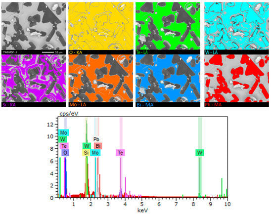As is evident from the obtained mapping data, in the case of the original samples not doped with PbO, the distribution of elements is equiprobable and isotropic in the structure of ceramics, while for the doped samples, the grains formed, according to the mapping data, contain large amounts of tungsten, oxygen, and lead, as well as an insignificant the amount of silicon. In this regard, it can be concluded that the grains formed as a result of PbO doping are inclusions of another phase or structural formations with a structure different from the general composition.