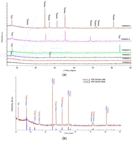 (a) X-ray diffraction patterns of the studied samples as a function of the PbO dopant concentration; (b) The results of X-ray diffraction of the TWBMSP-5 sample, for which the presence of diffraction reflections for the PbWO4 and PbMoO4 phases was observed.