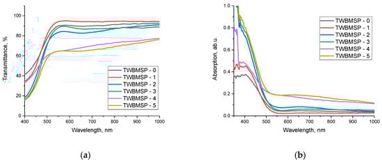 The study of the optical properties of the synthesized ceramics was carried out by analyzing the obtained transmission and absorption spectra in the UV-Vis range, which makes it possible to determine the alteration in the band gap and to establish the dependences of the influence of the formation of the PbWO4 and SiO2 phases on the transmission and absorption abilities. The results of changing the optical spectra are represented in Figure 6.
