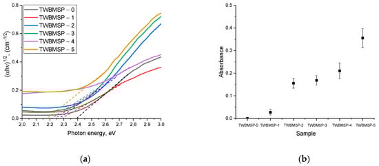 Results of the optical properties of samples under study: (a) Tauc’ plots; (b) Optical density results.