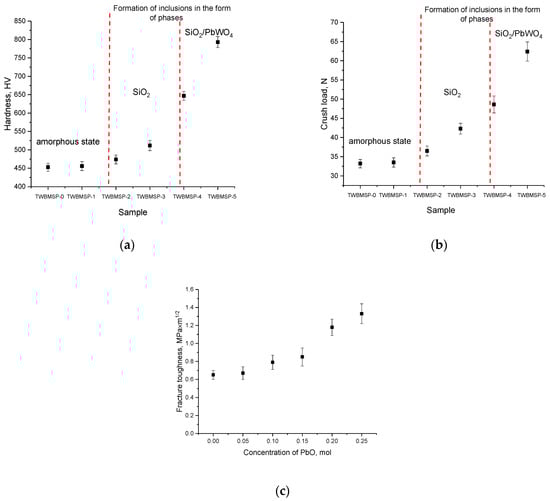 As is evident from the data provided, the greatest efficiency of changing the mechanical properties associated with hardening and increasing resistance to external influences is observed during the formation of PbWO4 inclusions in the structure, as well as transformations of the “amorphous glass” → “glass-like ceramics with well-ordered phase inclusions” type, which result into a growth of resistance to external influences. The hardening effect can be significantly affected by morphological changes associated with the formation in the structure of ceramics of inclusions in the form of grains, which are PbWO4 particles. The presence of these inclusions results in a change in the structural properties, phase transformations, as well as the formation of additional grain boundaries, leading to the appearance of boundary effects near which dislocations accumulate and prevent crack propagation under mechanical stress.