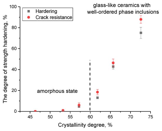 Figure 8c presents the results of assessing the variation in the fracture toughness value, which makes it possible to assess the resistance of the material to the propagation of cracks under compression. The overall appearance of the established trend in the variation in resistance to cracking when changing the type of ceramics from an amorphous state to being present in the composition of crystallized inclusions reflects a growth in resistance to the formation and further propagation of cracks.