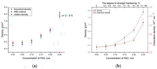 (a) The results of variations in the density of ceramics depending on the PbO dopant concentration; (b) Results of variations in density and dislocation density depending on the PbO dopant concentration.