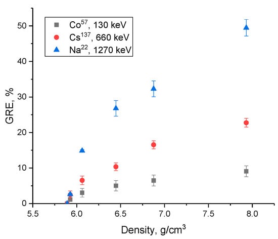 Figure 13 presents the results of a comparative analysis of the variation in the shielding efficiency depending on the density of the synthesized ceramics with an increase in the PbO dopant concentration, leading to phase transformations of the “amorphous glass” → “glass-like ceramics with well-ordered phase inclusions” type in comparison with the undoped sample. Shielding efficiency evaluation (GRE) was carried out using Formula (8):