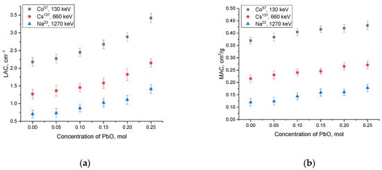 The overall appearance of the presented dependences indicates a positive effect of the alteration in gamma radiation shielding efficiency with an increase in the PbO dopant concentration. While the shielding efficiency of gamma radiation with an energy of 130 keV for all cases is more than 85%, which indicates a high shielding efficiency, it should also be noted that in the case of shielding gamma rays with an energy of 130 keV, a change in dopant concentration, leading to the formation of PbWO4 inclusions, the change in efficiency is no more than 5–10% with an increase in concentration and phase transformations. Such a change may be due to the fact that almost complete absorption occurs for these low-energy gamma quanta, and due to the interaction mechanisms, a variation in the phase composition does not have a particularly large effect on the absorption efficiency. At an energy of gamma rays of 660 keV, which are characterized by interaction mechanisms associated with the Compton effect, an increase in the concentration of the PbO dopant results in a more pronounced alteration in the absorption efficiency, which indicates that a variation in the phase composition of ceramics has a greater effect on the absorbing ability.