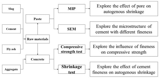 In this study, the compressive strength and autogenous shrinkage of concrete with different fineness were tested under the condition of variable temperature. The pore size and hydration degree were associated with the results of the above two tests through the paste microstructure and MIP results. The detailed flow chart is shown in Figure 2.