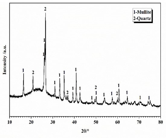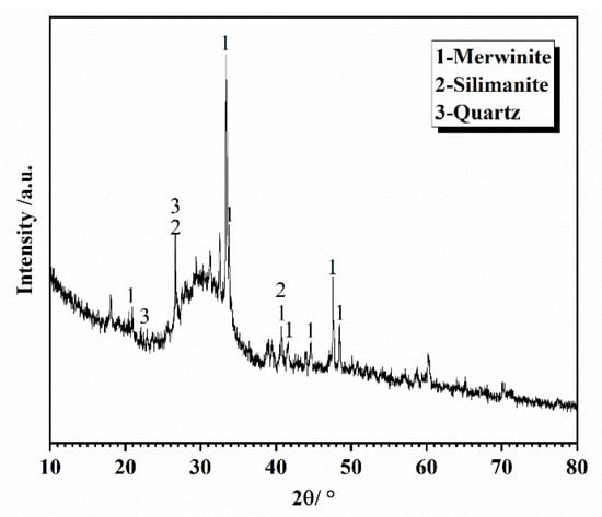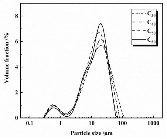 The experimental P-grade silicate cement was homemade, using Jiyuan clinker (Henan, China) and gypsum from Nanjing Zhonglian (Nanjing, China). The four types of cement produced by ball milling for 30, 40, 50, and 60 min, respectively, are C30, C40, C50, and C60. The specific surface areas were measured by using Burr’s specific surface area tester (Jianyi Instrument Co., Ltd. Wuxi, China) as 300, 327, 373, and 377 m2/kg, and the fineness of the four types of cement was measured by using a negative pressure sieve analyzer as 12.21 μm, 7.62 μm, 4.18 μm, and 3.44 μm, respectively. The manufacturer is yarn screening factory (Zhejiang, China). The fineness of the four types of cement was 12.21 μm, 7.62 μm, 4.18 μm, and 3.44 μm, and the four cement numbers were C30, C40, C50, and C60. The experimental S95 mineral powder and secondary fly ash were sourced from Nanjing Pudi (Nanjing, China). The experimental high-performance polycarboxylic acid water reducing agent was sourced from Nanjing Sobute (Nanjing, China). The chemical composition of cement, mineral powder, and fly ash is shown in Table 1; the mineral composition of cement is shown in Figure 3; the slag is shown in Figure 4; the fly ash is shown in Figure 5; the particle size distribution of cement is shown in Figure 6.