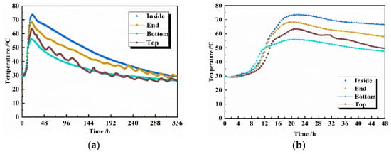 Concrete temperature change process of 336 h (a) and 48 h (b) in the actual project.