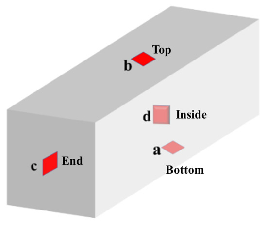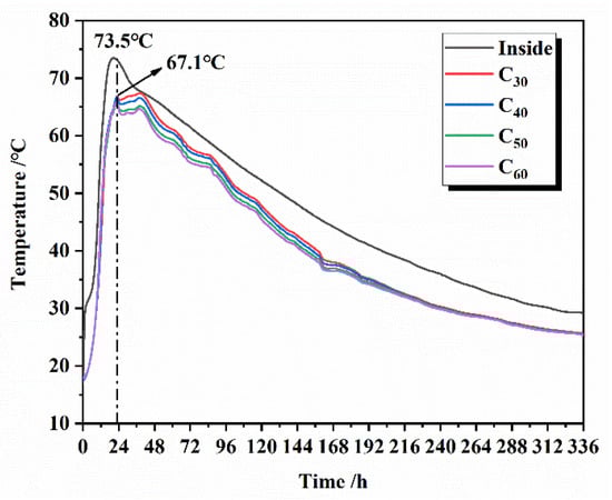 The temperature rise profile inside the concrete is simulated for actual situations, and the concrete specimens are maintained in a variable temperature curing chamber. The heating rate of the curing chamber is controlled in real time by the internal temperature of the specimen fed back from the strain gauge to match the temperature profile of the specimen as closely as possible to the actual project. The temperature data curve in the actual project is shown in Figure 7. The temperature peaks at the bottom (a), top (b), and end (c) are 55.9 °C, 63.4 °C, and 68.1 °C, respectively, all of which are lower than the 73.5 °C temperature peak inside (d) the middle of the concrete. The sampling points of concrete temperature in the actual project are shown in Figure 8. However, the time taken to reach the maximum temperature at all four locations is close, at around 18–20 h, and all cooled down from the maximum temperature to an ambient temperature in approximately 14 days. In order to reduce the influence of environmental factors, we chose the internal temperature profile to represent the temperature change history inside the concrete. The process of temperature change shown by the strain gauges placed in the concrete specimens during the experiment is shown in Figure 9, with a warming time of 18 h and a cooling time of 14 days. Since the time of the actual project is in summer and the simulated experiment is in autumn, the difference in season causes the overall temperature of the actual project to be higher than the overall temperature of the simulated experiment by about 6 °C. The heating and cooling rates of the simulated experiments were consistent with the temperature change history of the concrete in the middle of the actual project. The maintenance continued using PVC cling film to wrap the concrete specimen to ensure no moisture exchange with the outside world. The specimens were removed and tested for compressive strength after 3, 7, 28, and 60 days of maintenance.