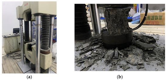 Compressive strength is one of the essential properties of concrete, and the value of early compressive strength is used to evaluate the degree of hydration of cement particles in concrete. The test method followed the Standard for Mechanical Test Methods of General Concrete GB/T50081-2002, using cubic compressive strength as the strength characteristic value of concrete. The concrete was sealed with PVC film as soon as it was poured into the mold to ensure it was in a simulated moisture-proof condition. We put the concrete into the curing box to simulate the internal temperature change of the concrete for 24 h and then demoulded it. After demoulding, we continued to put it into the curing box at variable temperatures. The concrete compressive strength tester (a) and the compressive strength specimen (b) are shown in Figure 10.