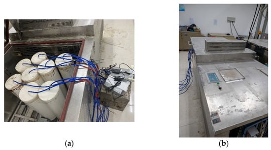 The testing device for concrete autogenous shrinkage was composed of a PVC hollow pipe with a height of 500 mm and a radius of 160 mm with a VWS-15 vibrating string strainer made by Ge Nan Industrial Company (Nanjing, China) and a GDA16 full-function data acquisition instrument. The effective length of the specimen poured into the tube is 400 mm. A sealing cap with an inner diameter of 160 mm is coated with special PVC glue to seal the hollow tube’s end as the mold’s bottom. Mix four kinds of cement numbered C30, C40, C50, and C60 in batches, and then pour the concrete into the shrinkage test device, with the device numbers C30, C40, C50, and C60 in sequence. The concrete was poured to a height of 400 mm. During that time the strain gage was placed in the middle of the concrete to ensure that the gage takes uniform stress data, and 20 mm of liquid paraffin was poured into the upper part of the concrete after the concrete had set to insulate the upper part. This was covered with the same sealing lid as the bottom and the mold was used for measuring the autogenous shrinkage into the variable temperature maintenance box. The initial setting time of concrete was used as the starting point for measuring the autogenous shrinkage strain. The data collection device (a) and curing box (b) are shown in Figure 11.