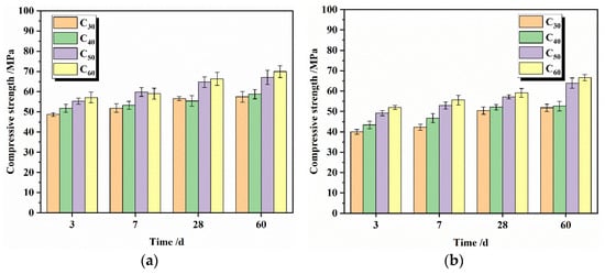 The compressive strength of concrete under a variable temperature curing environment is shown in Figure 12a. With the increase of silicate cement fineness, the early compressive strength of concrete gradually increases. The smaller the fineness of cement, the faster the early growth of compressive strength of concrete. The particles of 3 μm–30 μm are the main factors affecting the strength at each age. The proportion of particles of 3 μm–30 μm to the total particles in C30, C40, C50, and C60 is 68.5%, 73.47%, 81.17%, and 78.21%, respectively. At 3 days, the compressive strength of C60, the finest particle, reached 57.4 MPa, compared with 56.5 MPa for C50, 51.8 MPa for C40, and 48.7 MPa for C30. At 60 days, the compressive strengths reached 69.9 MPa, 66.3 MPa, 59 MPa, and 57.1 MPa, respectively. The compressive strength is negatively correlated with the fineness of cement particles, and the different concrete strength values at intermediate ages follow the above rule.