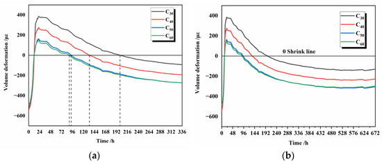 After the peak temperature, as the temperature decreases, the degree of influence of temperature on the total strain gradually decreases, and the effect of the contraction of the cement itself on the overall volume deformation gradually increases. The total strain data for the four concrete became negative at 200 h, 133 h, 93 h, and 89 h, respectively. Eventually, the different cement fineness caused different times of starting shrinkage and total shrinkage of the concrete. The total shrinkage strain for different fineness of cement under variable temperature conditions was from small to large for C30, C40, C50, and C60, corresponding to −92 με, −193 με, −273 με, and −274 με at 14 days, respectively, the line 0 in Figure 13 is the reference line of total volume deformation, and the shrinkage of concrete gradually stabilized after more than 14 days. The finer the cement particles, the earlier the corresponding concrete begins to shrink in volume under the same variable temperature conditions, and the greater the total shrinkage at the same age.