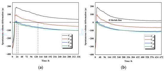 The greater the fineness of the silicate cement at 28 days of age, the earlier the concrete starts to self-shrink. Because the finer the particles in the early stage, the more contact area between cement and water, the faster hydration reaction rate can be obtained, and the greater the number of hydration products C-S-H gel generated per unit of time. At 7 days, the finest-grained group of concrete C60 microstrain was −80 με. The microstrains of concrete in groups C30, C40, and C50 are 72 με, −19 με, and −74 με, respectively, the line 0 in Figure 14 is the reference line of autogenous shrinkage, which differ from group C60 by 152 με, 61 με, and 6 με, respectively. It can be seen from Figure 14 that the concrete autogenous shrinkage growth starts to slow down after 7 days, and this trend is 7 days ahead of the total volume deformation. At this time, the autogenous shrinkage microstrain of the two groups of concrete C60 and C50 with the finest particles are close. This trend is maintained during the age period of 7 days–28 days. This indicates that there are other factors besides the fineness of the cement that affect the size of the autogenous shrinkage of the concrete after 7 days of age. After 14 days, the autogenous shrinking microstrain of the concrete in the three groups was unchanged, and the hydration reaction was finished.