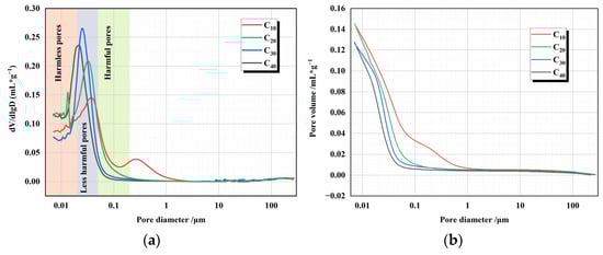 The strength of the cement paste and the pore structure are closely related. PoreMaster GT-60 automatic mercury compression meter was used to test the pore structure of four types of net cement pastes, the equipment is made by Quantachrome company (Boynton Beach, FL, USA). Cement paste pore size (d) is divided into four classes: less than 20 nm for harmless pores; 20~50 nm for less harmful pores; 50~200 nm for harmful pores; more than 200 nm for more harmful pores. The actual control of hardened cement slurry strength, permeability, and volume changes is the pore size distribution rather than the porosity. The water–cement ratio and the degree of hydration mainly govern the pore gradation. Pores larger than 50 nm mainly harm the strength and permeability of the cement paste; pores smaller than 50 nm primarily affect the drying shrinkage and creep of the cement paste.