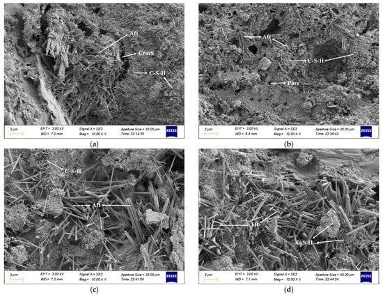 The study characterized the internal structure of cement paste with different fineness using SEM analysis. The SEM images of cement paste numbered C30, C40, C50, and C60 in a, b, c, and d of Figure 16, respectively.