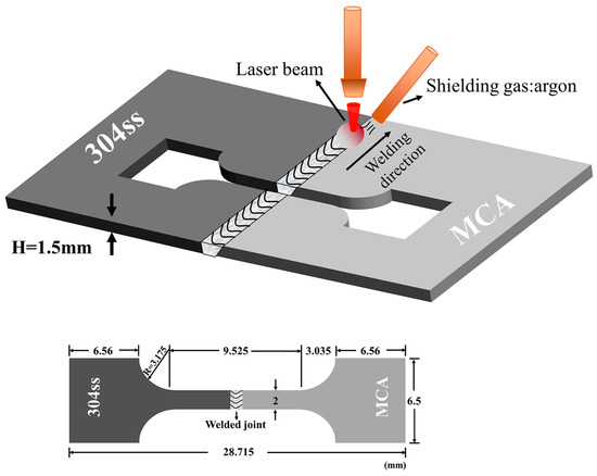 The multicomponent alloys (CoCrFeNi, CoCrNi, and CoNiV) used in this paper were produced from pure Co, Cr, Fe, Ni, and V particles (purity ≥ 99.9%) by vacuum arc melting suction casting furnace. Subsequently, the ingots of multicomponent alloys were cold rolled into 1.5 mm and then annealed at 900 °C for 1 h followed by water quenching to ambient temperature. The commercial 304 stainless steel (hereafter referred to as 304ss) with a thickness of 1.5 mm was also prepared as a base metal. The chemical compositions of all base materials are listed in Table 1. Before welding, all sheets of base metals were cut into pieces with dimensions of 25 mm × 25 mm × 1.5 mm (thickness). Subsequently, the surfaces of the pieces to be joined were ground with silicon carbide paper and cleaned ultrasonically with alcohol. The welding experiments were carried out using a continuous fiber laser beam with a power of 2100 W and a speed of 200 mm/min. It should be noted that the laser beam was focused on the upper surface of the joining area throughout the welding process. The welding process was graphically illustrated in Figure 1.