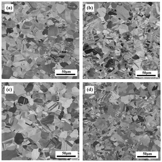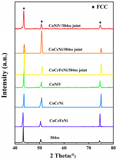 In order to compare the microstructural characteristics of base materials before welding, the constituent phases of base materials before welding were determined by XRD, as shown in Figure 2. Concurrently, the basic microstructures of the multicomponent alloy and 304ss before welding were characterized by SEM (back-scattered mode), and the corresponding results are shown in Figure 3. It is clear that all of the base metals before welding are comprised of a single phase with a face-centered cubic (FCC) structure, while the discrepancy in the XRD peak position is ascribed to a different chemical composition (Figure 2). Furthermore, it is well-known that the distribution of XRD peak intensity was closely related to the characteristics of texture. In the case of basic microstructure before welding, this distribution was a result of annealing texture, which was relevant to the nature of the alloy and the characteristics of the as-rolled microstructure. As to the fusion zone after welding, the texture was mainly influenced by the solidification process. Hence, it is reliable to deduce that the abnormal XRD pattern of the CoCrNi/304ss joint may be corresponded to a special solidification process. In addition, the microstructure of base metals before welding possesses an equiaxed grain, which is typically fully recrystallized microstructure. It can also be found that an abundant number of annealing twins are observed in all the base metals, which is closely related to the low stacking fault energy of 304ss and MCAs [18,19]. Furthermore, the corresponding average grain size of base metals was measured by the linear intercept method and the results are summarized in Table 1. It can be found that the initial grain sizes of base metals are ranged from 12 μm to 16 μm, which can be basically regarded as at the same level.