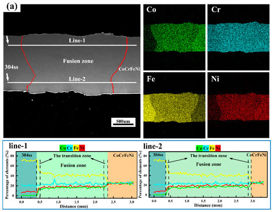 According to the elemental distribution of Figure 4, it can be found that all of the dissimilar welding joints can be divided into three regions, i.e., 304ss, FZ, and MCA. It can be found that there was no existence of a precipitate or second phase, consistent with the results of XRD (Figure 2). Meanwhile, the element distribution among FZ was homogeneous, which can be mainly attributed to the high solid solution of all elements (Fe, Ni, Co, Cr, and V) in liquid metal and dramatic internal convection among the welded pool during laser welding [24]. Moreover, the EDS line scanning results demonstrate that the homogenous distribution of elements along the cross-sectional direction is analogous in both the upper and lower surfaces of the molten pool, whilst a narrow transition region with gradient distribution of all elements was observed in the vicinity of the FZ boundary.