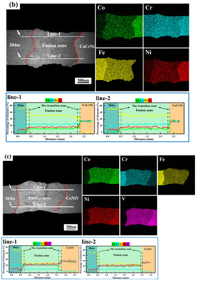 In order to reveal the evolutions of microstructure and element during the welding process, the cross sections of dissimilar laser welded joints were characterized in detail. The overview image of the welded joint and the corresponding element distribution is depicted in Figure 4. It can be observed that all dissimilar welded joints present fine weld geometry and weld penetration throughout the base material without any volumetric or macro welding defects. This result indicates that the application of laser welding to join 304ss and MCA (CoCrFeNi, CoCrNi, or CoNiV) presents good weldability.