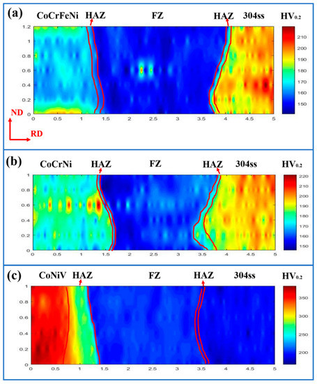 The microhardness distribution of the welded joint was measured by mapping mode and the results were described by heatmaps as shown in Figure 6. The average hardness of base materials and FZ in the welded joint were also summarized in Table 2. As for CoCrFeNi/304ss and CoCrNi/304ss welded joints, it can be found that the hardness of CoCrFeNi (166 HV) and CoCrNi (179 HV) was lower than that of 304ss (197 HV), while the fusion zones possess the lowest hardness with approximate values of 152 HV and 158 HV, respectively. This distinct reduction in the hardness of the FZ was mainly associated with the formation of coarse grains during the welding solidification process [30]. As a comparison, the CoNiV base metal shows the largest hardness (353 HV) in CoNiV/304ss welded joints. Concurrently, the hardness of FZ (203 HV) presents an analogous value as that of 304ss (197 HV), although a much coarser grain was obtained in the FZ (Figure 3a). This phenomenon can be deduced as a result of the significant solution-strengthening effect of the V element [31].