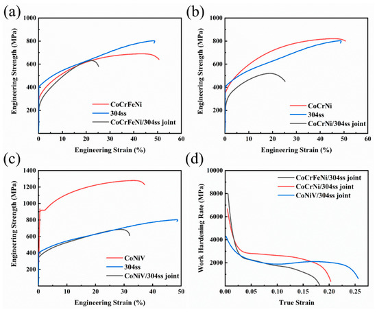 Mechanical behaviors of laser dissimilar welded joints. (a–c) Engineering stress–strain curves; (d) work hardening rate.