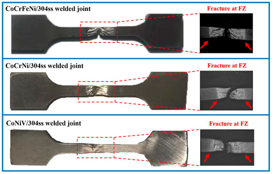 The engineering stress–strain curves of base materials and as-welded samples are shown in Figure 7a–c, and the corresponding representative mechanical properties are summarized in Table 3. In comparison with the base materials, it can be found that all of the welded joints demonstrate a significant decrease in both strength and ductility. As to the welded joint of CoCrFeNi and 304ss, the yield strength (YS) and ultimate tensile strength (UTS) can be respectively achieved as 237 MPa and 510 MPa, while the total elongation (TEL) was 22.6%. In comparison with the CoCrFeNi alloy, the CoCrNi possesses improved strength and ductility. Accordingly, the laser welded CoCrNi/304ss joint presents optimized mechanical properties compared to those of the CoCrFeNi/304ss joint, i.e., improved strength and slightly deteriorated ductility were obtained. As for the CoNiV alloy, the values of YS (906 MPa) and UTS (1279MPa) were the highest among all of the base materials, while fine ductility with the smallest TEL value of 33.2% was obtained. Correspondingly, the laser welded joints of CoNiV/304ss possessed the optimized mechanical properties in all welded joints, i.e., the strength and ductility were improved synergistically. The corresponding highest YS and UTS were, respectively, 338 MPa and 686 MPa, whilst the optimized TEL was achieved as 28.9%.