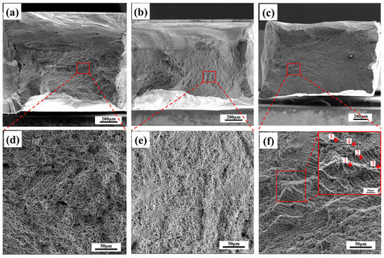 The fractography of as-welded samples is displayed in Figure 9. It can be clearly observed that the fracture surfaces of the CoCrFeNi/304ss and CoCrNi/304ss welded joints were filled with equiaxed dimples, which is the typical feature of ductile fracture. In addition, the dimple depth of the CoCrFeNi/304ss welded joint is much larger, indicating an improved toughness as compared to that of the CoCrNi/304ss welded joint [35], which is consistent with the superior ability of plastic deformation as mentioned in Figure 7d. As a comparison, the failure mode of the CoNiV/304ss welded joint can also be determined as ductile fracture filled with dimples, while two different kinds of dimples were observed. As shown in Figure 9f, except for the existence of equiaxed dimples that are identical to other welded joints, some equiaxed dimples were aggregated to present lamellar characteristics with a vivid and strictly parallel boundary. This lamellar structure and the abundant steps observed in Figure 9f were deduced to be the feature of displacive deformation, which is consistent with the aforementioned discussion that the FZ of the CoNiV/304ss welded joint withstood more plastic deformation.