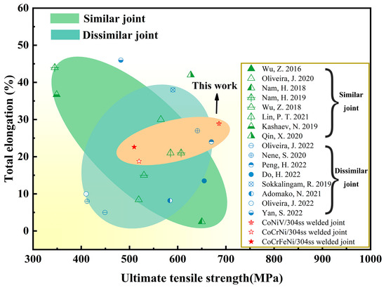 As mentioned above, the mechanical properties of a laser dissimilar welded joint between MCA and 304ss were closely related to the species of MCA, among which the CoNiV/304ss joint possesses the optimal combination of strength and ductility, i.e., YS of 338 MPa, UTS of 686 MPa, and TEL of 28.9%. Furthermore, the mechanical properties of welded joints estimated in our paper were compared to those reported results about similar and dissimilar welding of MCAs, as shown in Figure 10. It can be found that the mechanical properties of similar welded MCA joints occupied a much wide range from the low strength-high ductility combination to the high strength-low ductility combination. As a comparison, the mechanical properties of dissimilar welded MCA joints possessed relatively lower ductility combined with analogous strength. It is clear that the CoNiV/304ss welded joint shows an excellent strength-ductility synergy at room temperature, which indicates the great potential of multicomponent alloy/304ss welded joints for future industrial applications.