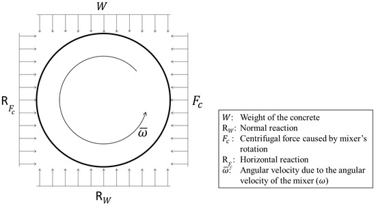 in which dm is the diameter of the mixer (m), and the angular velocity of the mixer (rad/s). For the LIEBHERR ring-pan mixer Type R [60] used in this study, the nominal capacity, outer diameter, and rotational velocity of the mixer are 1 m3 of concrete, 2.425 m, and 26 rpm, respectively.