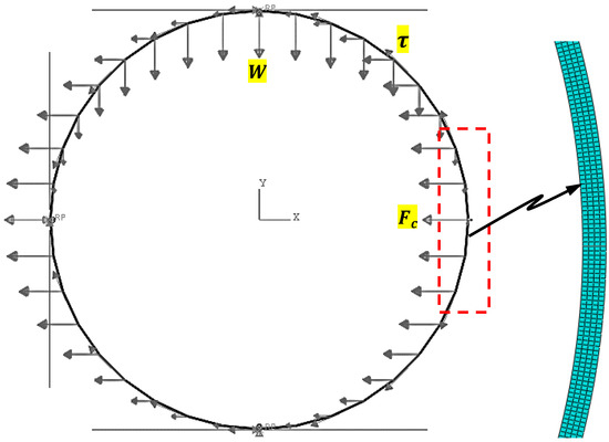 An idealized 2-D plane strain finite element (FE) model was developed for this analysis using the commercial finite element program ABAQUS [77]. The FE model, which is shown in Figure 2, consists of a single spherical capsule surrounded by three contact surfaces representing the bottom and side edge of the mixer and the concrete atop the capsule. The contact interface between the mixer wall and the capsule outer layer is modeled as surface friction, with a static friction coefficient of 0.34 [78]. The top contact interface represents the cohesive structure of the fresh concrete atop the capsule. The three loads shown, i.e., vertical, horizontal, and circumferential, represent the weight of the concrete atop the capsule, the centrifugal force, and the shear force, respectively. The FE mesh consists of 8-node biquadratic plane strain quadrilateral elements (CPE8), with 4 elements along the thickness of the capsules, with a 1:1 aspect ratio.