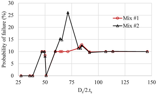 Figure 4 displays the probability of failure calculated for the capsules’ radius to thickness for both concrete mixes. The effects of the capsules’ geometry and rheological properties of the concrete mix are evident. The results show that for capsules whose radius-to-thickness ratio is greater than 45, their probability of failure increases from 0 to 10%. Moreover, the combined effect of the concrete rheological properties and the capsules’ geometry on the capsules’ survivability is complex. For mix #2, an increase from 10% to 26% is observed for the capsules whose radius-to-thickness ratio range between 60 and 80, and an increase from 10% to 13% is observed for both mixes for the capsules whose radius-to-thickness ratio range between 80 and 90. In general, the capsules’ survivability decreases to 90% once the capsule radius-to-thickness ratio is greater than 45. This finding agrees well with a previous recommendation for capsule radius-to-thickness ratio ranging between 30 and 100 for rupturing instead of debonding upon the cracking of hardened concrete [72]. Based on these results, the recommendations are amended to a capsule radius-to-thickness ratio of 30 to 45 for surviving concrete mixing, yet still rupturing upon the cracking of hardened concrete.