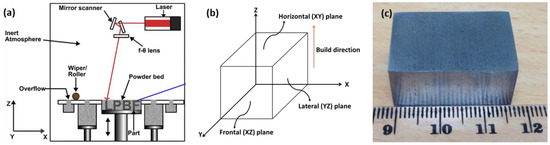 Schematic of (a) L-PBF process [25] and (b) sample orientation and associated investigated planes, together with (c) optical photographs of the L-PBF-processed sample.