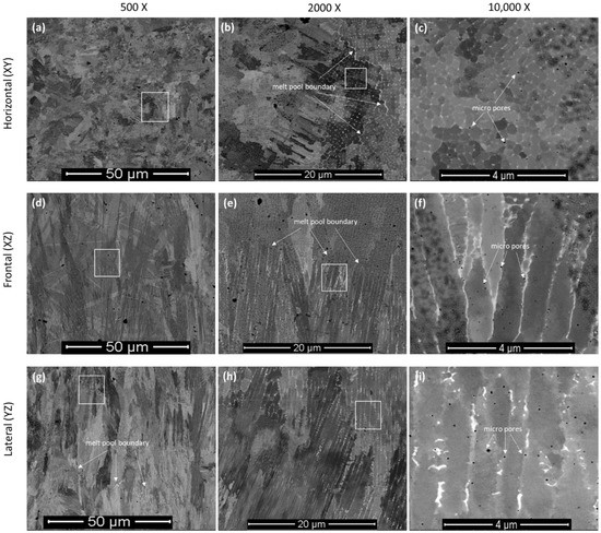 SEM micrographs of the P-LBF-processed Inconel 718 after metallographic polishing, at different magnification, on: (a–c) horizontal, (d–f) frontal and (g–i) lateral in relation to the build direction. The white boxes indicate the areas from where the higher magnification images were obtained.