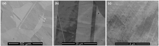 SEM micrographs of cast Inconel 718 after metallographic polishing at different magnification: (a) ×500, (b) ×2000 and (c) ×10,000. The white arrows indicate the location of the twins.