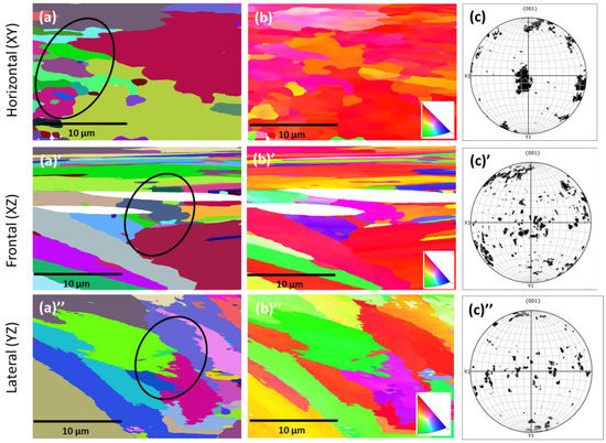 Grain boundary (GB) (a,a’,a”), inverse pole figure (IPF) (b,b’,b”) and pole figure (PF) (c,c’,c”) maps on the L-PBF-processed Inconel 718 alloy: (a–c) horizontal, (a’,b’,c’) frontal and (a”–c”) planes in relation to the build direction (BD). The black circles indicate the area where changes in gain orientation took place.