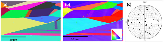 EBSD maps on cast Inconel 718 alloy: (a) Grain boundary (GB), (b) inverse pole figure (IPF), and (c) pole figure (PF) maps.